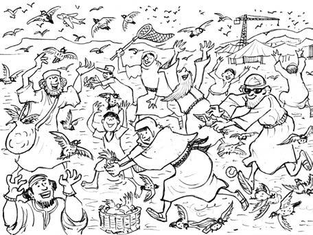 De pronto, se escuchó un ruido en el cielo. Miles y miles de pájaros volaban por encima del campamento: eran codornices. Pero algo raro les pasaba: volaban a ras del suelo y era muy fácil cazarlas, casi era tan fácil como estirar la mano y coger un pájaro. ¡Vaya banquete que tuvieron para la cena!