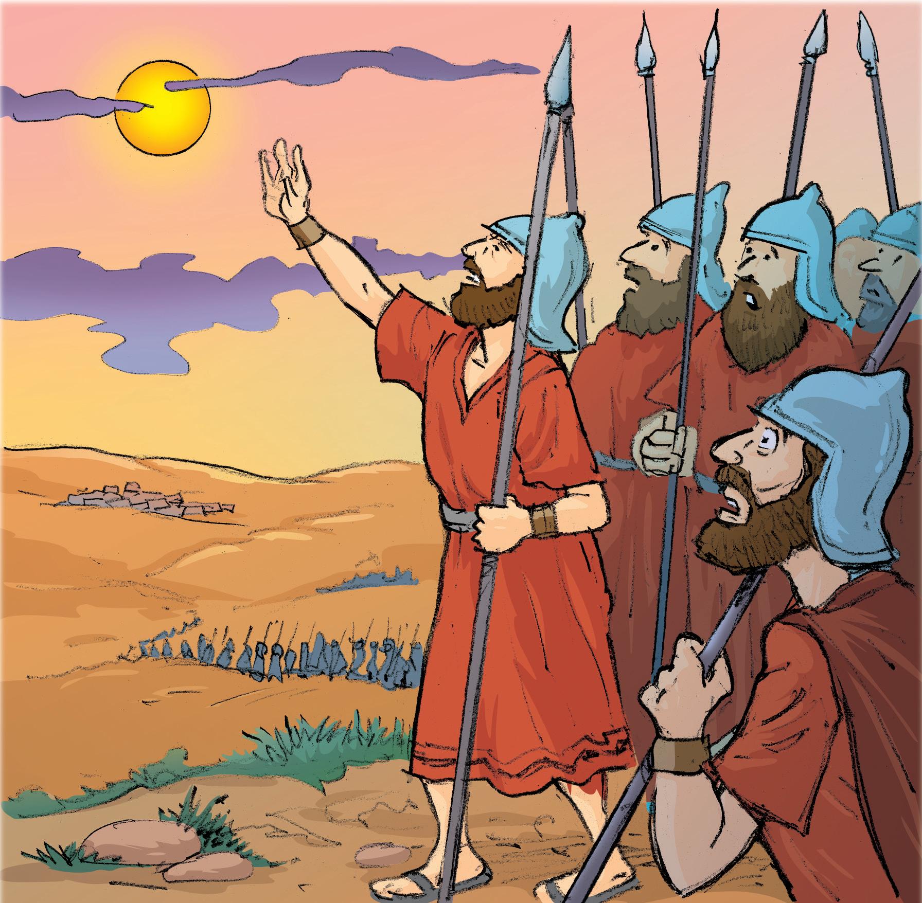 Los gabaonitas estaban aprendiendo cómo Dios ayudaba a su pueblo, Israel. Y también que Dios los estaba ayudando a ellos a pesar de que habían intentado hacer trampas en su alianza con Israel. A pesar del granizo que perseguía a los ejércitos de los reyes cananeos, parecía que la batalla no iba a terminar ese día. Cuando se hiciera de noche, los cananeos se reorganizarían y podrían volver a atacar por la mañana. Cuando el ejército israelita llegó a la cima de la montaña y Josué miró al cielo, se dio cuenta que no podían terminar la batalla antes de que oscureciera. Josué, sus soldados y los soldados gabaonitas deberían seguir peleando. Pero, ¿cómo? Ya estaba a punto de anochecer. Ahora necesitaban otro milagro. Dios le dio fe a Josué para que ordenara algo asombroso. Dios hizo algo que nunca había hecho antes… ni lo haría después. (Lee todo esto en Josué 10: 12-14)