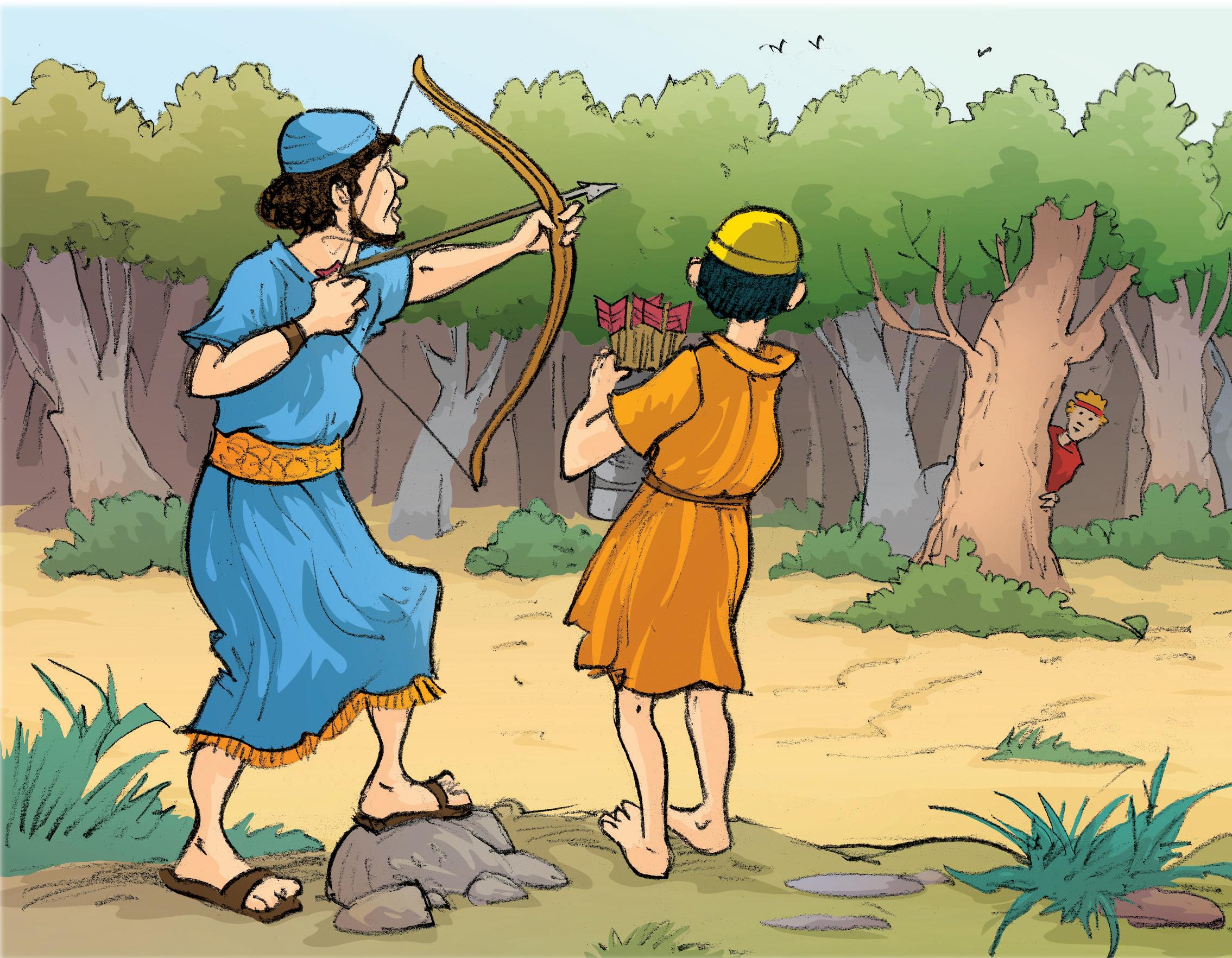 A la mañana siguiente Jonatán y su escudero salieron al campo. David estaba escondido donde pudiera escuchar lo que Jonatán le dijera al muchacho. Jonatán lanzó las flechas y gritó a su criado que las flechas estaban «más allá». Cuando David escuchó lo que dijo Jonatán, supo que debería huir para salvar su propia vida. Luego Jonatán despidió al escudero y David pudo salir de su escondite.