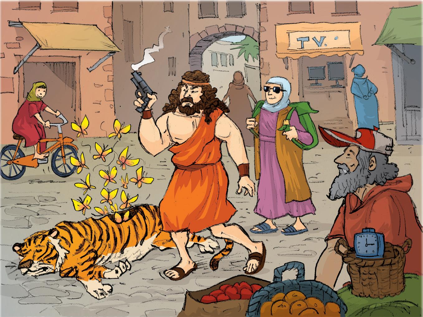 David se fue a Nob, el lugar donde estaba el Tabernáculo. El sacerdote Ahimelec vio a David y pensó que todavía trabajaba para Saúl. Tampoco David le dijo que estaba huyendo del rey. El sacerdote hospedó a David. Luego David le preguntó si había algún arma en la ciudad. Solo había una. (Puedes saber qué arma era leyendo 1 Samuel 21: 9)