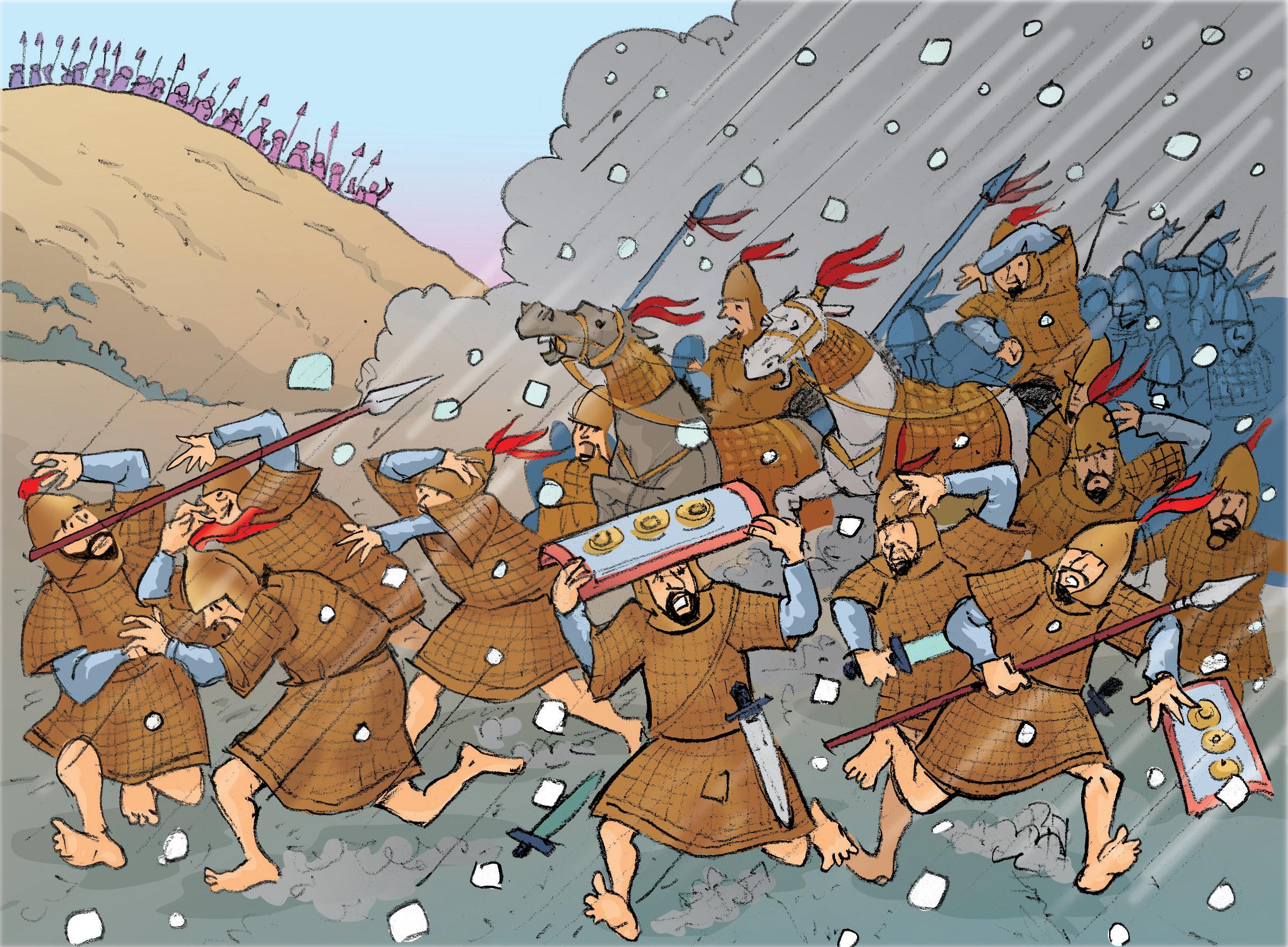 ¡Comenzó a granizar! Dios envió enormes trozos de granizo sobre sus cabezas. Una vez más Dios estaba demostrando que es él quien gana las batallas.