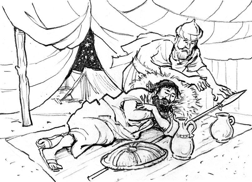 Cuando David supo que Saúl volvía a perseguirlo decidió investigar él mismo qué ocurría. Esa noche, David y su sobrino Abisaí se adentraron sigilosamente en el campamento de Saúl. En medio del campamento dormían plácidamente Saúl y Abner, el capitán de su ejército, sabiendo que estaban protegidos por todos sus soldados.