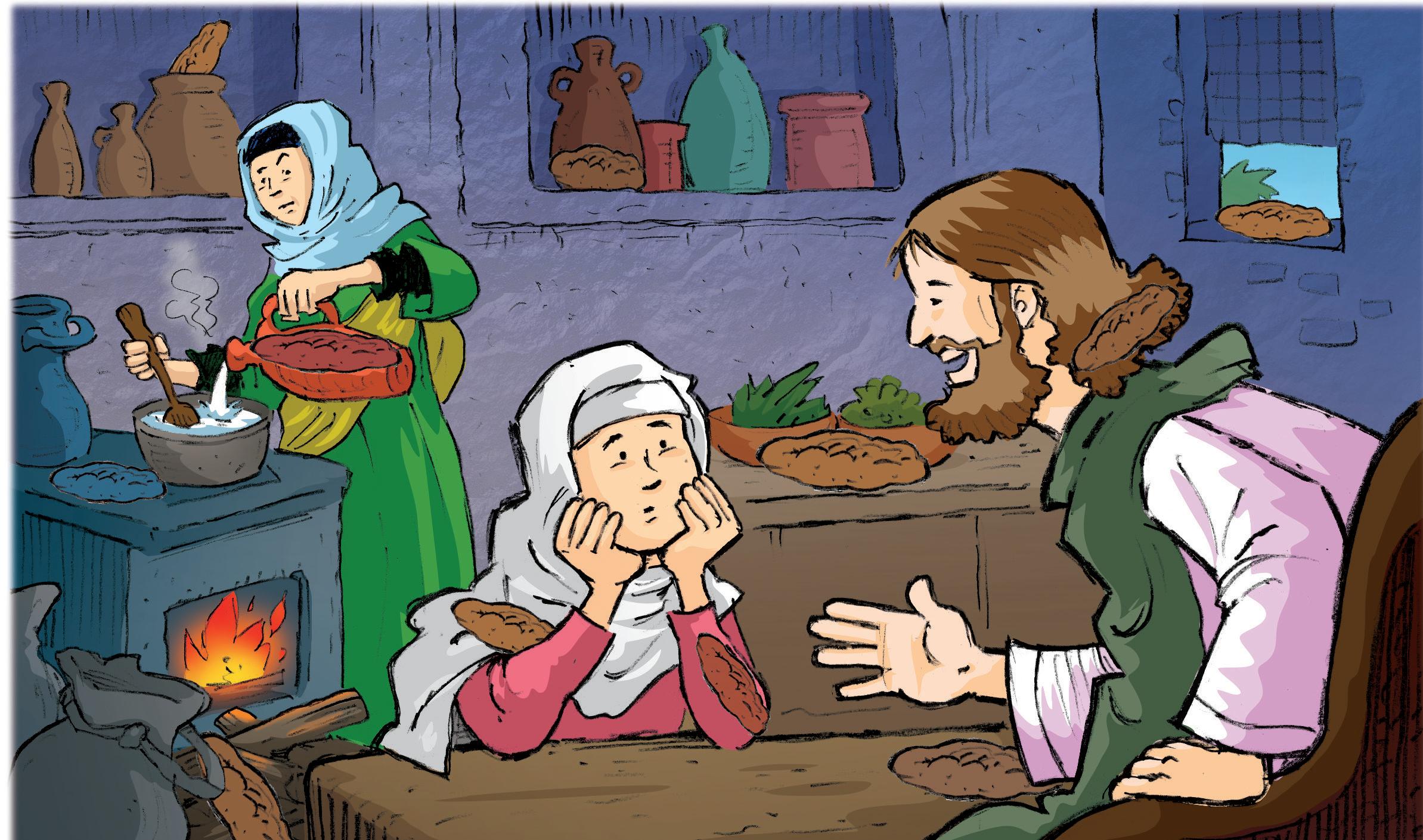 —Marta, tú estás demasiado preocupada. No haces otra cosa que pensar en lo que hay que hacer para que yo y mis discípulos nos sintamos bien y a gusto en tu casa. Y te lo agradezco. Pero me gustaría mucho más que hicieras como María que, cuando yo estoy contigo, te olvides de las preocupaciones, te sientes conmigo y disfrutes. No pienses tanto en ofrecerme la mejor parte de la comida y quédate tú con la mejor parte de mi compañía, igual que ha hecho María.