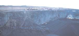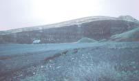 4: Esta cantera, grande y activa (localidad 17) muestra claramente la línea de contacto limpio e ininterrumpido entre el basalto y el loess.
