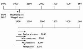 partir de esa fecha es posible fijar una cronología absoluta que abarca hasta el año 910 a.C. Es importante observar que, «sin embargo, cuando se intenta retroceder más allá del primer milenio empiezan a surgir problemas» porque «no es posible prolongar sin más las fechas absolutas del primer milenio hasta el segundo milenio» (Glass 1984, p. 92). Sin ningún lugar a dudas, las fechas del segundo milenio a.C. son relativas. Además, entre los s. XXIV y XVI a.C. se dan dos discontinuidades de duración desconocida; la primera de ellas tiene lugar «alrededor de 2000 a.C. y la última hacia 1600 a.C.» de modo que «varios incidentes específicos y algunas eras están pendientes de ser fijados en el tiempo absoluto» (Glass 1984, p. 92; la cursiva es del original). Ante el hecho de que «solo son posibles fechas aproximadas, las estimaciones temporales se derivan de las evidencias meramente arqueológicas, los datos paleográficos... y las escasísimas fechas establecidas con el carbono radiactivo» (Knapp 1992, p. 716).