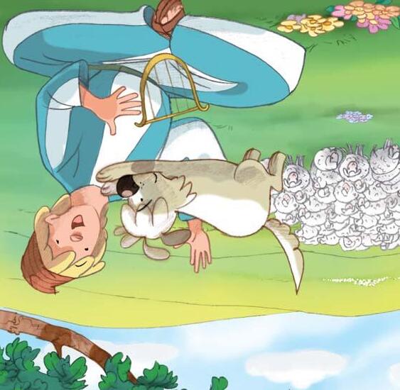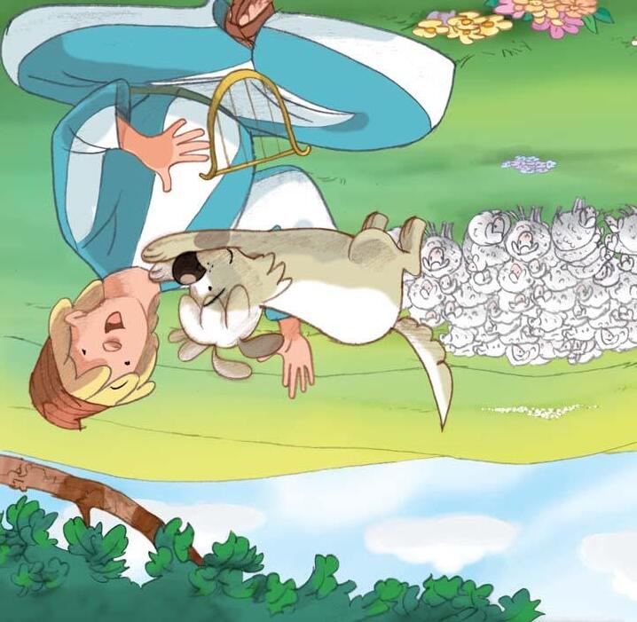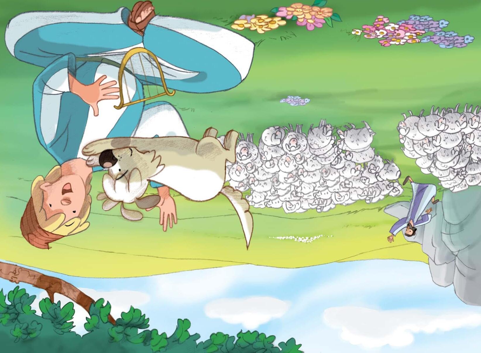 Cuando el perro llegó a los pastos, atravesó entre las ovejas hasta llegar al árbol donde estaba sentado David. Tenía una pequeña lira, como un arpa pequeña, y estaba cantando.