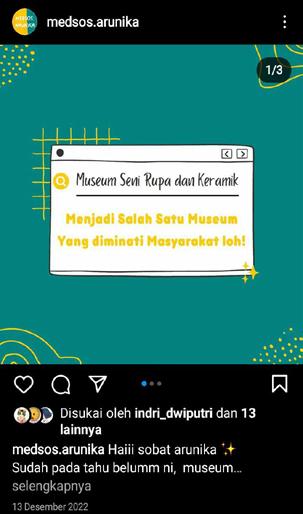 Konten pertama Arunika merupakan sebuah infografis. Sebagai konten pertama sekaligus pembuka, infografis tersebut membahas sekilas tentang Museum Seni Rupa dan Keramik beserta angka pengunjung dalam setahun. Selain informasi singkat dan angka pengunjung, di postingan berikutnya Arunika memberitahukan dimana letak dan alamat museum tersebut berada.