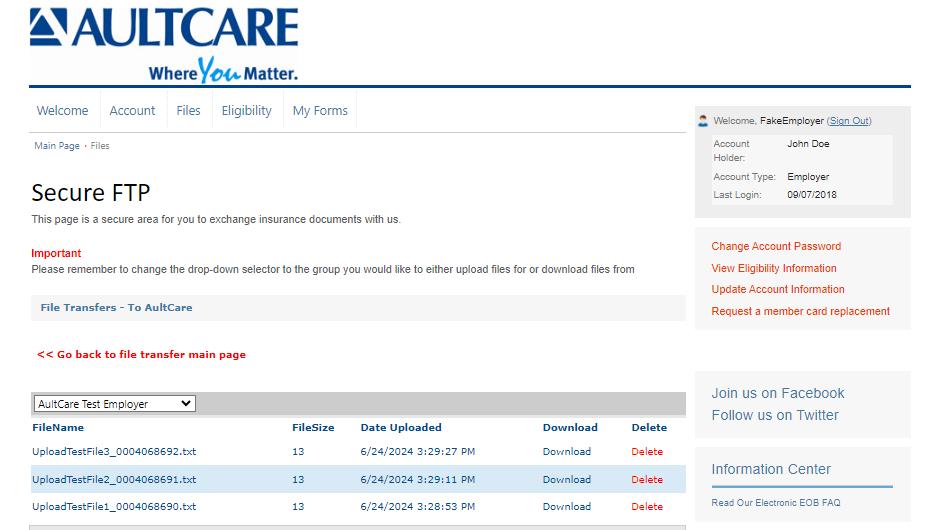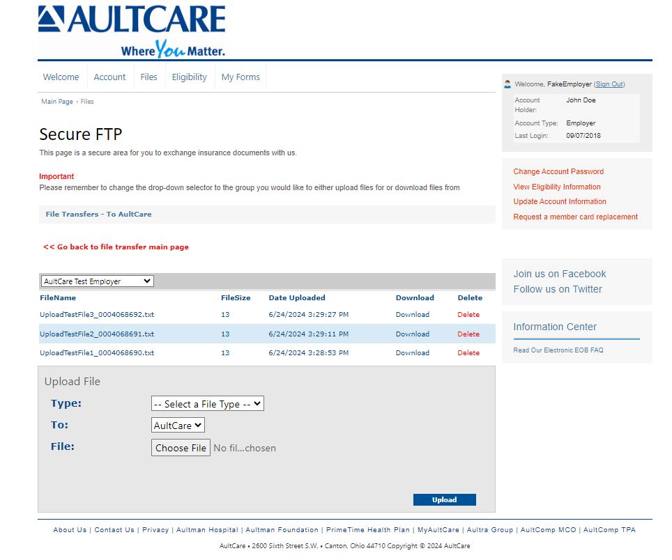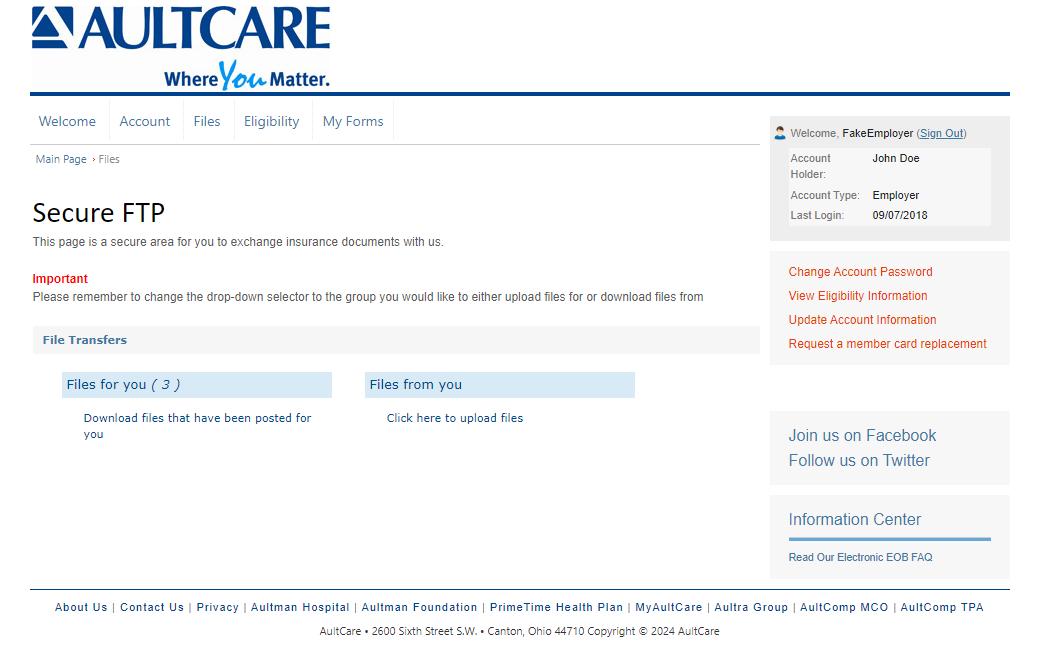 • Location B is a link. This link will take you to your Secure FTP Center The FTP Center allows you to download all files AultCare uploaded to your account. This is where you can upload files to AultCare.