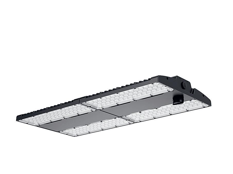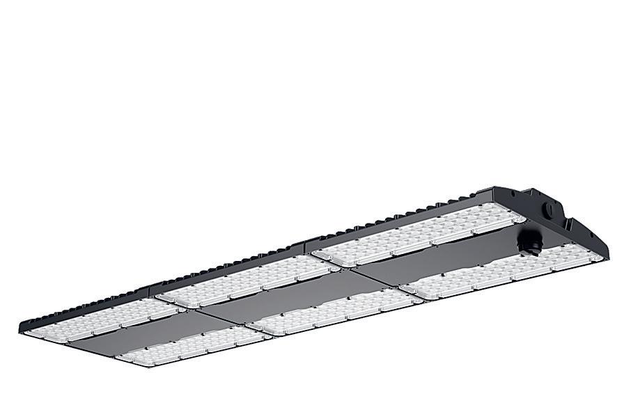 Effiziente und leichte IP65-Leuchte mit einem Lichtstrom von bis zu 34.000 Lumen. Verstellbare Optik und verschiedene Lumenoptionen über DIP-Schalter. Kettenmontage.