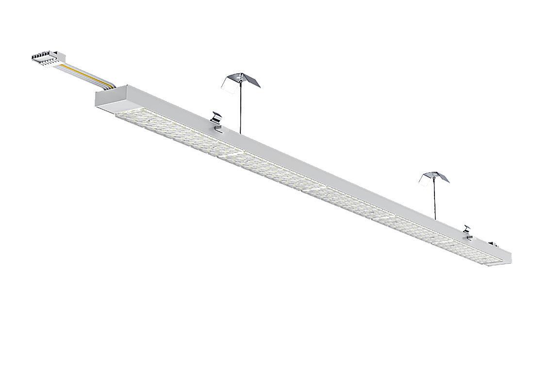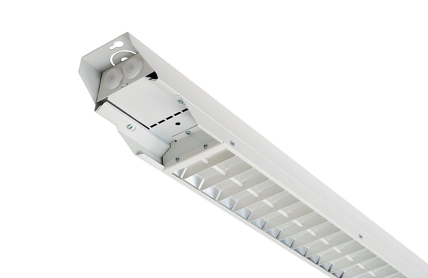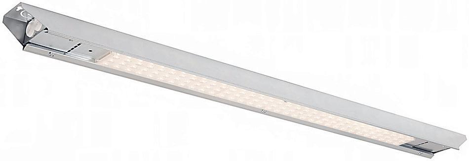 Effiziente IP23-Leuchte in zwei Längen. Deckenmontage oder Drahtseilmontage möglich. Abnehmbare Optikschiene für einfache Wartung.
