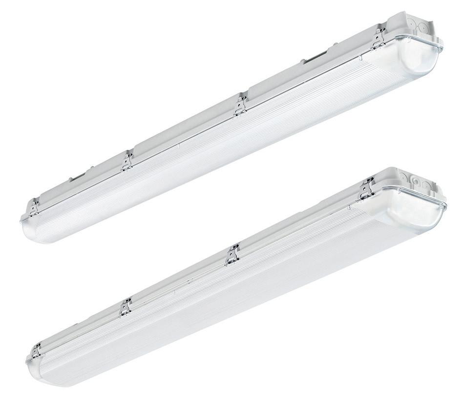 Effiziente IP23-geeignete Leuchte in drei Längen verfügbar. Zwei Standard Lichtverteilungen: breit oder mittel.