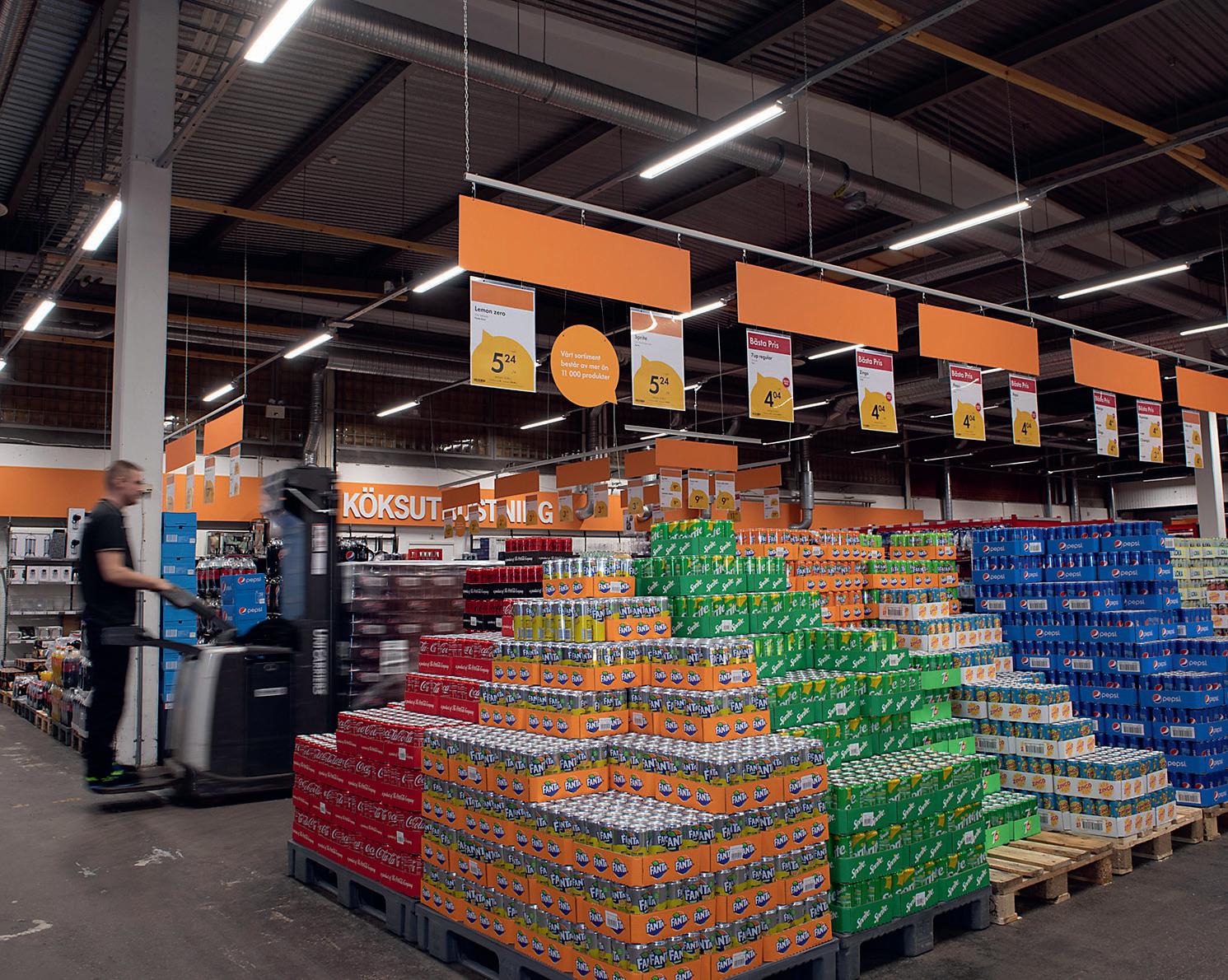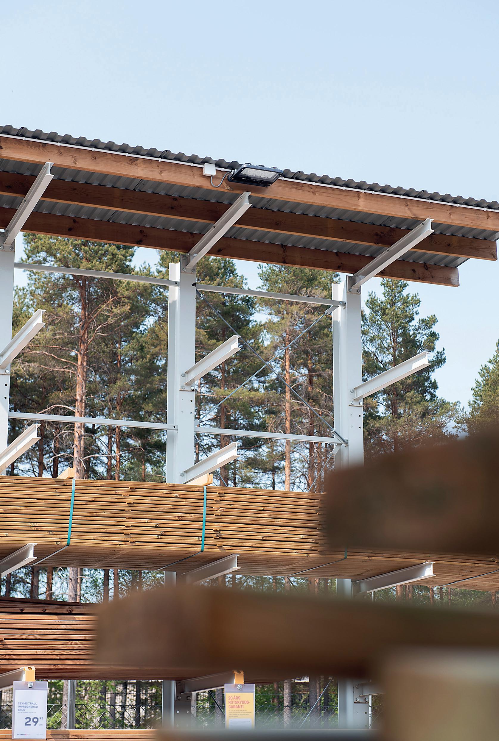 erleuchtet sowohl die Fassade als auch den großen Holzlagerplatz von Byggmax in Hultsfred, Schweden.