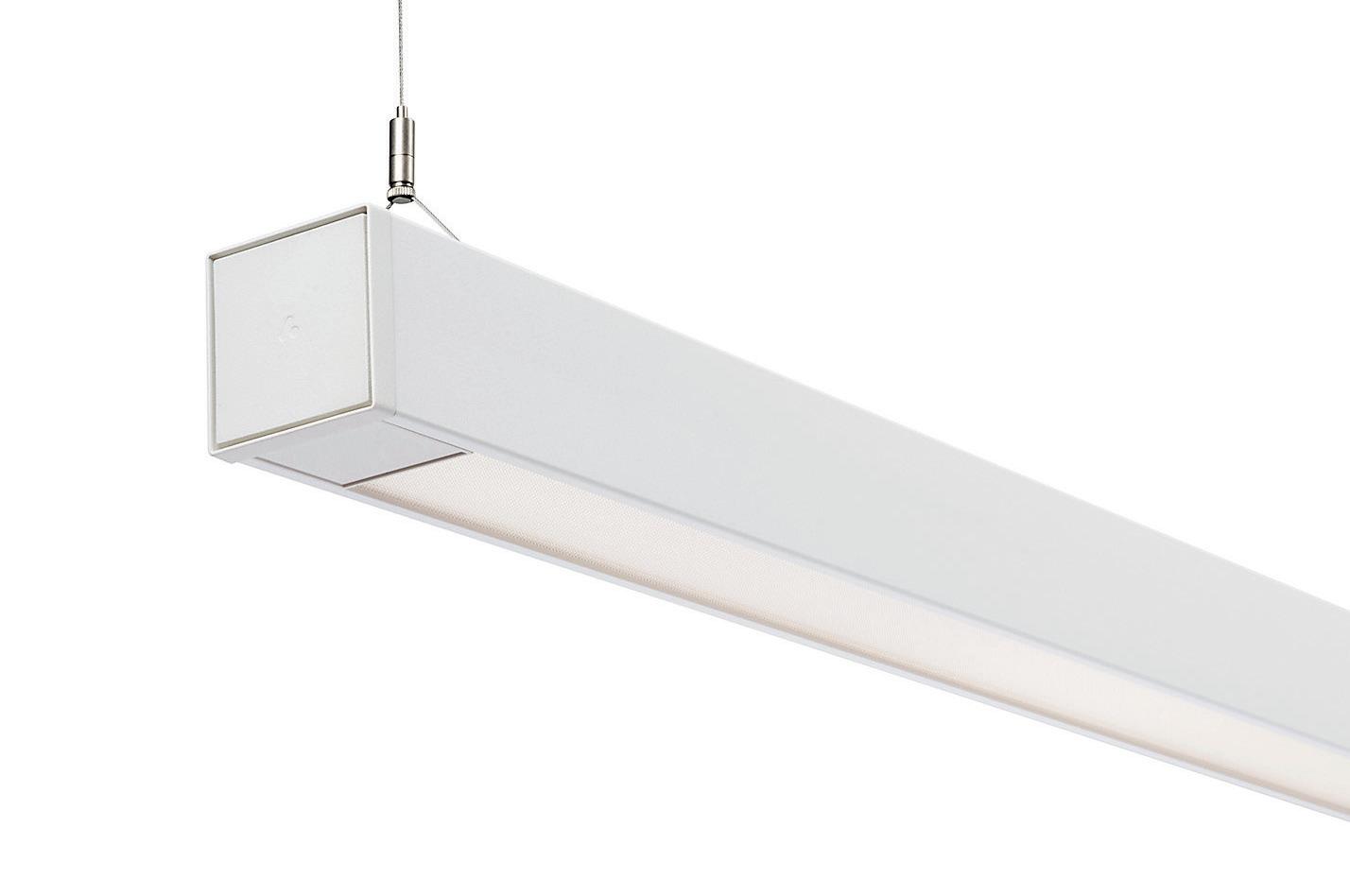 Elegante Büroleuchte aus recyceltem Aluminium. Standardlänge 1200 mm, weißes Finish. Mit CRI 80 für gute