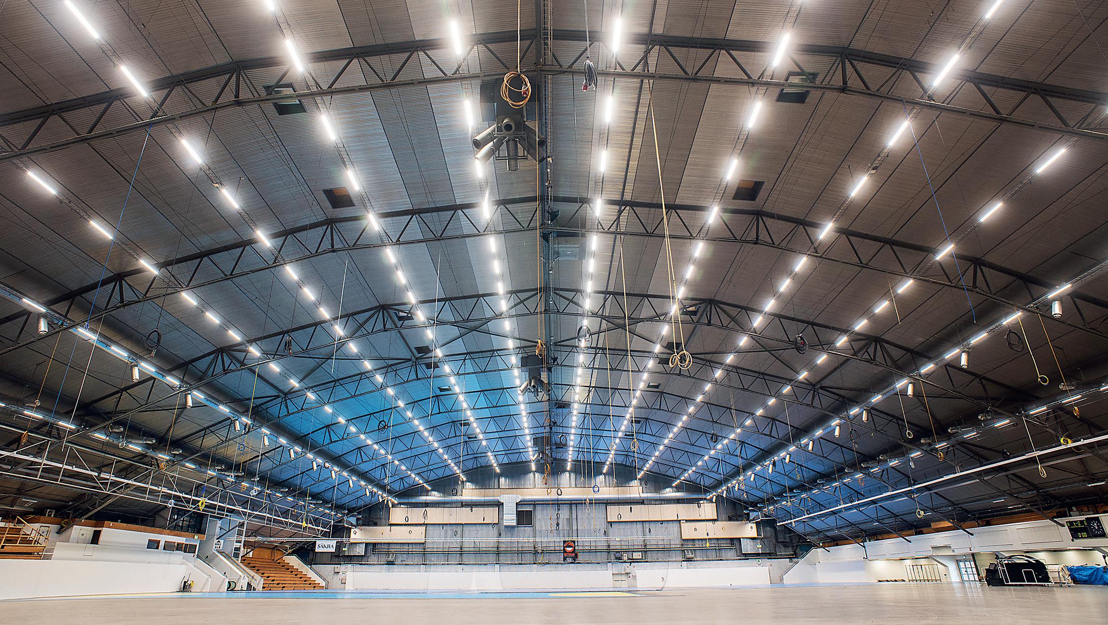Ballschutz DIN 18032-3. 5.000–18.000 lm, bis zu 174 lm/W. IP23, IP54. D-Zeichen, ENEC.