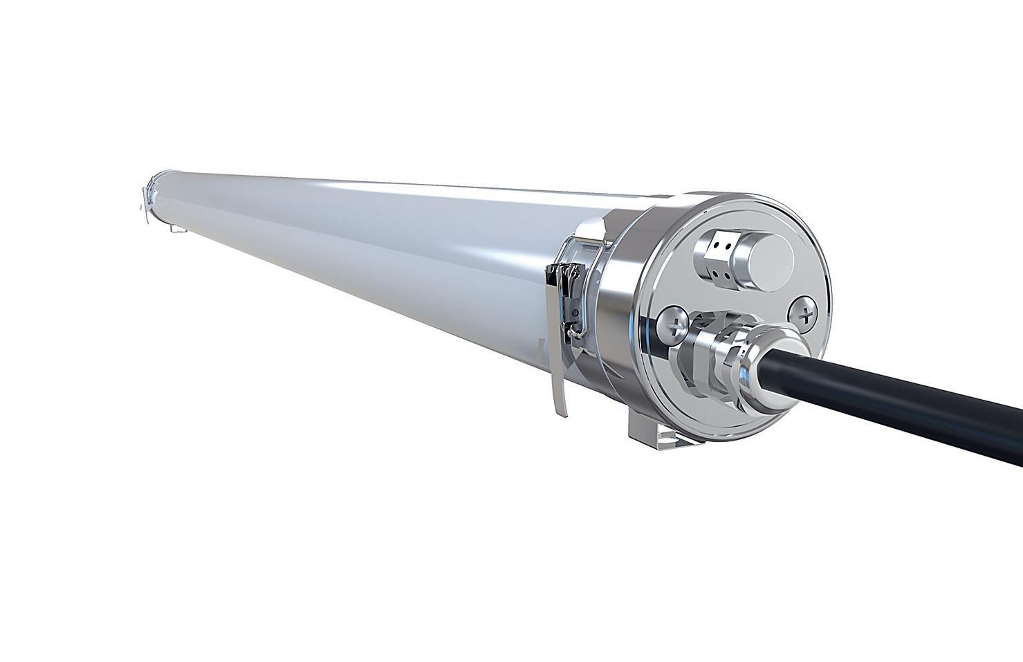 Rohrleuchte für die Fertigungsindustrie. Widerstandsfähig gegen anspruchsvolle Bedingungen. Vergossene Edelstahlendkappen mit Belüftungsventil verhindern die Kondensatbildung.