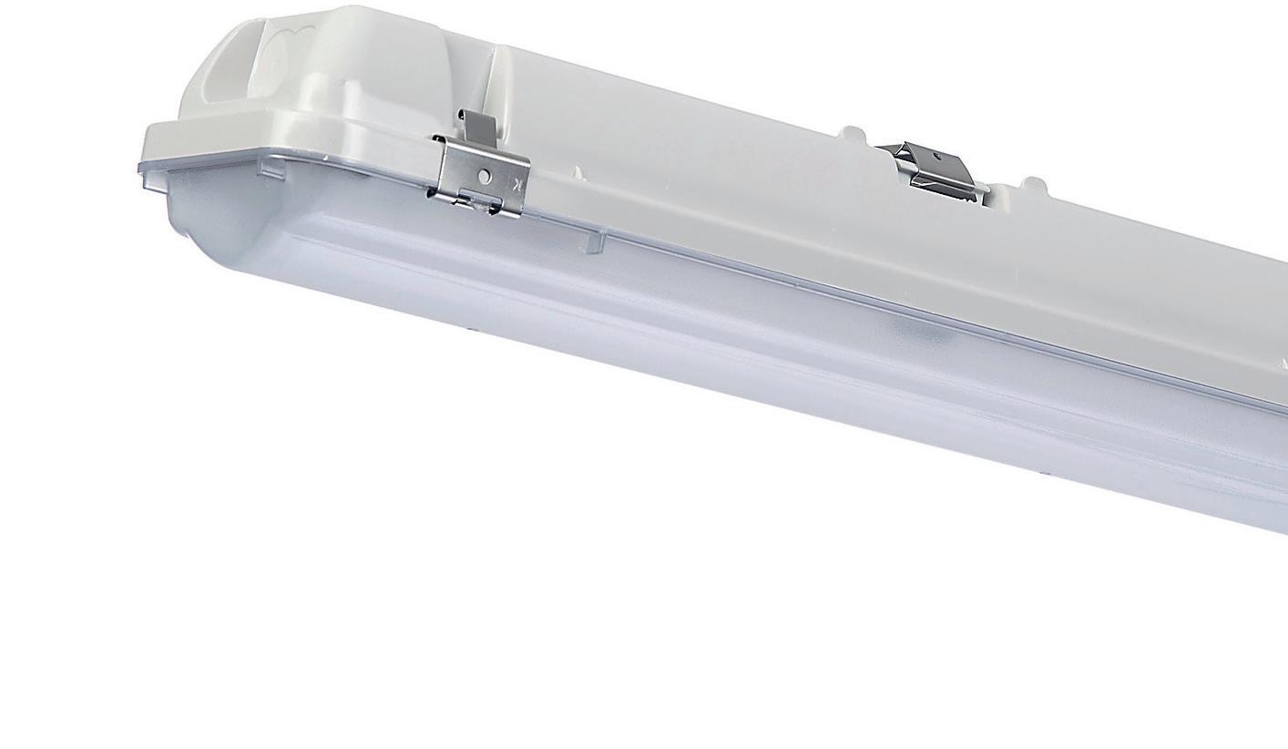 Robuste IP66-Leuchte für Industrie, Lager und Parkhäuser. Aluminiumgehäuse mit diffuser Kunststoffabdeckung. Durchgangsverdrahtung mit Kabelführungen an beiden Seiten.