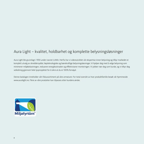 Aura Light – kvalitet, holdbarhet og komplette belysningsløsninger Aura Light ble grunnlagt i 1930 under navnet LUMA. Herfra har vi videreutviklet vår ekspertise innen belysning og tilbyr markedet et komplett utvalg av skreddersydde, høyteknologiske og bærekraftige belysningsløsninger. Vi hjelper deg med å velge belysning som minimerer miljøbelastningen, reduserer energikostnaden og effektiviserer monteringen. Vi jobber nær deg som kunde, og vi tilbyr deg veiledning gjennom hele lysprosjektet for å sikre at du er 100% fornøyd. Denne katalogen inneholder vårt fokussortiment på våre armaturer. For total oversikt av hver produktfamilie besøk vår hjemmeside www.auralight.no. Flere av våre produkter kan tilpasses etter kundens ønske.