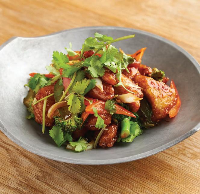 Friteerattua tofua ja kasviksia hapanimelä-chilikastikkeessa