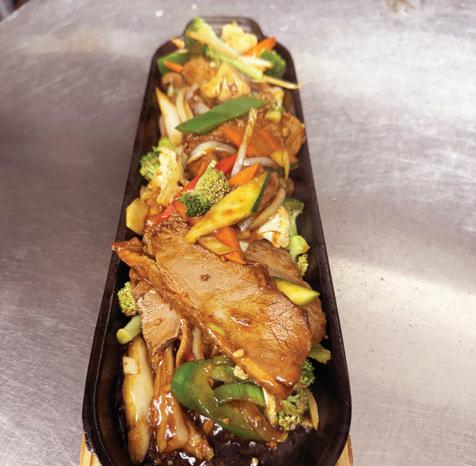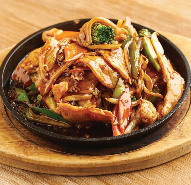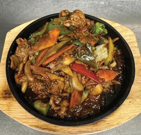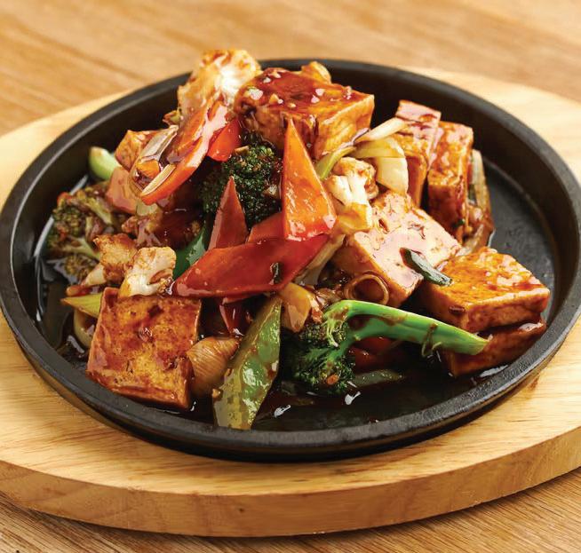 Tofu and vegetables in garlic sauce on an iron hot plate