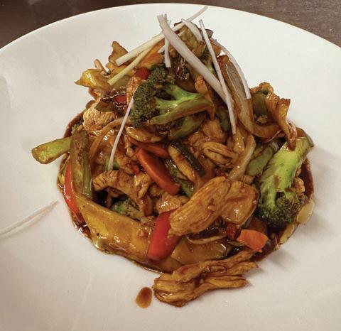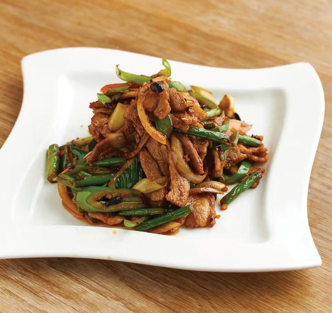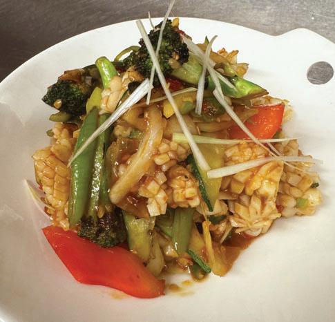 Friteerattua tofua, munakoisoa ja kasviksia chili-mustapapukastikkeessa