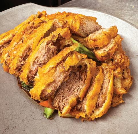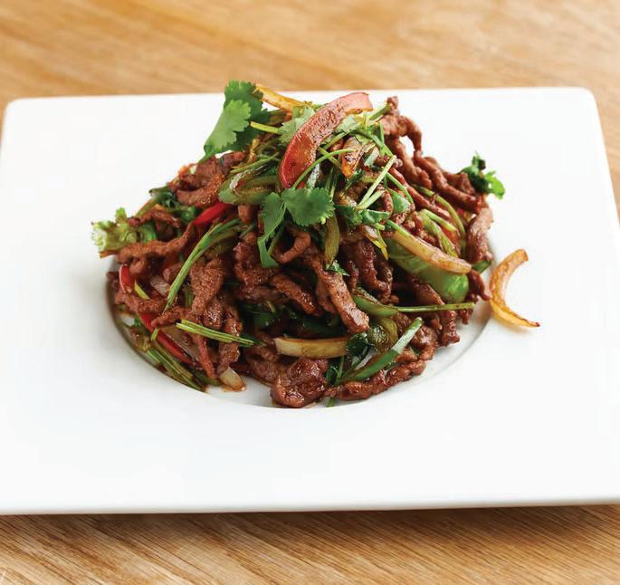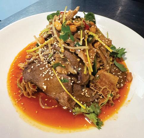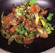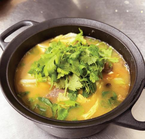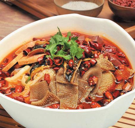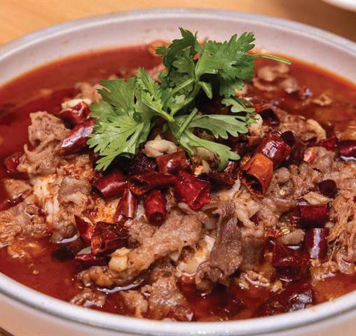 Poached sliced beef, vegetables and peanuts in spicy chili sesame broth