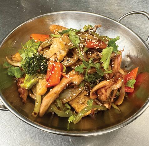 Tofua ja kasviksia valkosipulikastikkeessa kuumalla pannulla