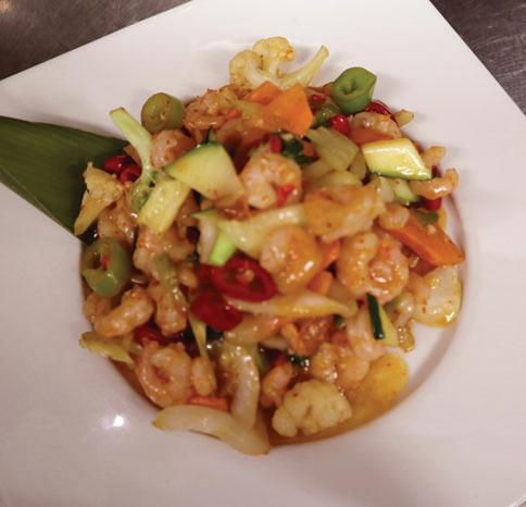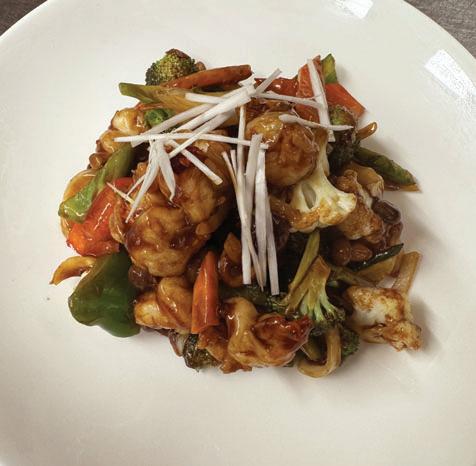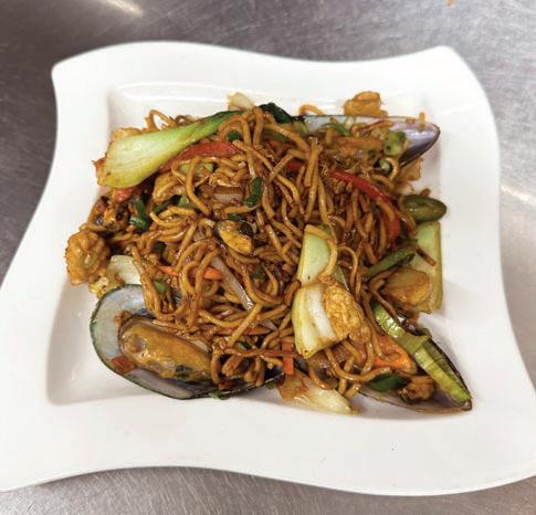 Stir fried noodles, shrimp, squid, mussels, scallops, fresh vegetables and egg