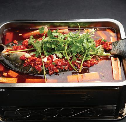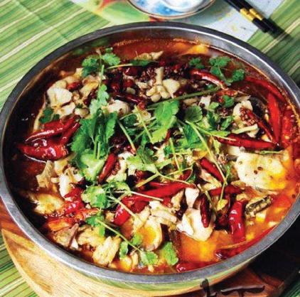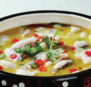 Poached sliced perch, vegetables and peanuts in hot chili sesame broth