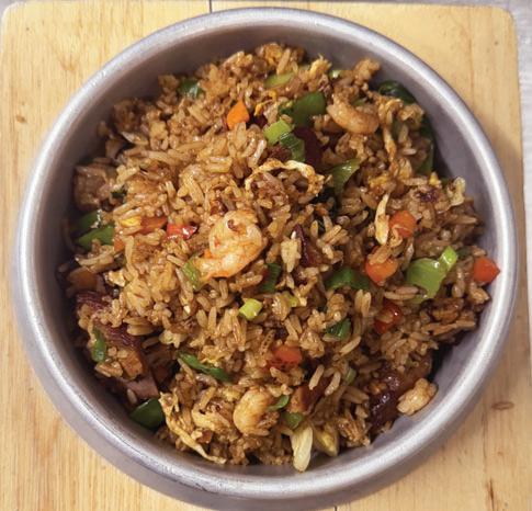 Fried rice, shrimps, char siew pork and egg