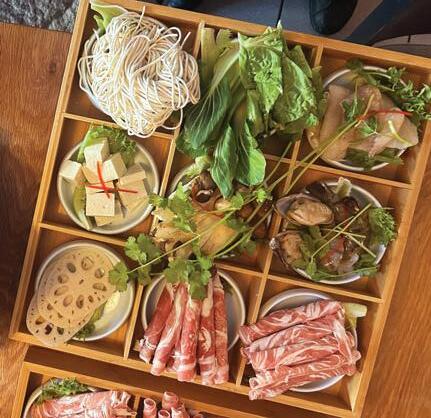 Two soup bases, vegetables, assortment of meat, fish and seafood, noodles and tofu