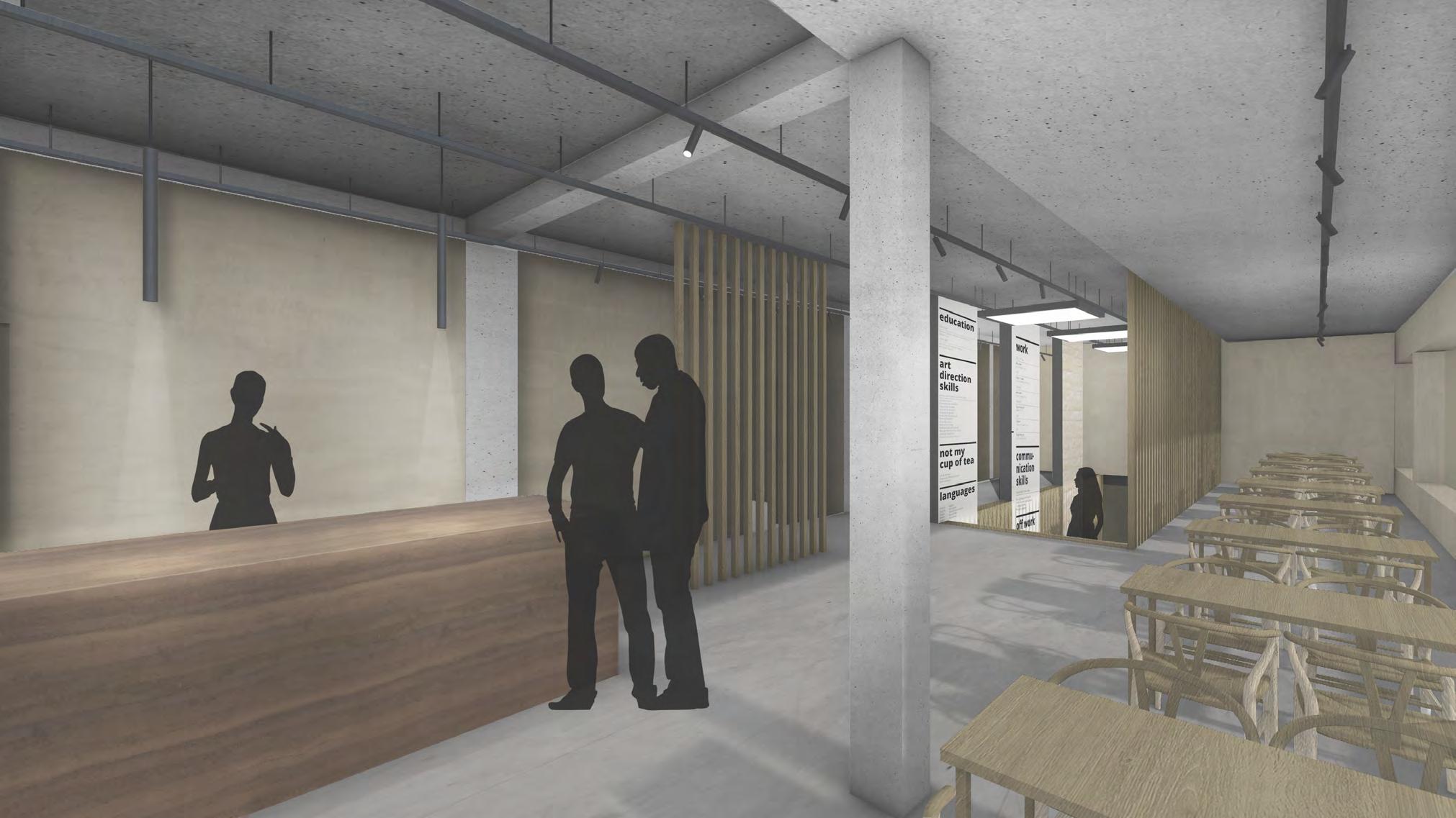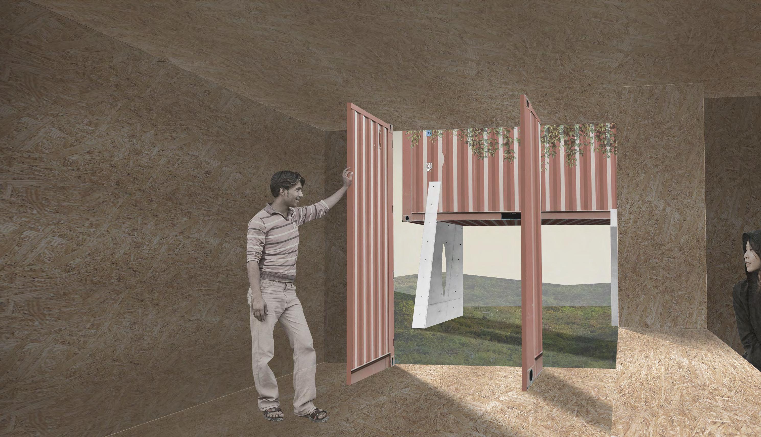 for the second visualization, the building was reimagined using repurposed shipping containers. the interior was designed to be lined with esb-panels, emphasizing sustainability and innovative reuse of materials.