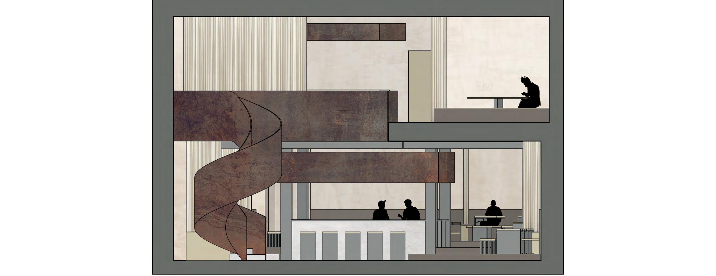 our design approach prioritized maintaining the original building structure and materials wherever possible, ensuring a mindful and sustainable renovation process. to reflect the sustainable focus of the building, we incorporated eco-friendly materials such as clay, wood, hemp, and bricks, all of which are showcased in the showroom. we chose a color palette of natural, warm, earthy tones to complement the materials used and enhance the overall aesthetic, while also allowing the showcased materials to stand out prominently. we logically structured the building into two main zones. the public zone is open to guests, allowing them to explore and engage with the space freely. in contrast, the private zone is not accessible at all times, providing necessary privacy for specific functions. we utilized the existing concrete structure to delineate these zones effectively. at the heart of our design concept is a stair system that not only enables guests to access the lower level but also connects the two buildings. along these stairs, large panels and shelves display the sustainable materials, inviting visitors to see and touch them. this interactive element enhances the educational aspect of the showroom, making sustainability tangible. the façade design adheres to the same principles as the interior, showcasing the building‘s original structure through the use of wooden beams on the exterior. this approach honors the building‘s history while seamlessly integrating it with the new sustainable design.