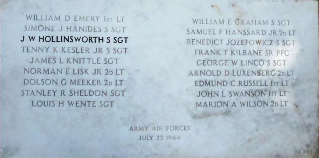 Staff Sergeant Jay W. Hollinsworth of 1541 Emporia Street served as a nose gunner on a Consolidated B-24 Liberator when his aircraft collided with another plane over the Konjuh Mountains in Yugoslavia on July 22, 1944. His remains were recovered and then returned to the United States on May 17, 1956, and are buried at the Jefferson Barracks National Cemetery, Missouri. Hollinsworth served with the 740th Bomber Squadron, 455th Bomber Group, Army Air Force. He was 27 years old at the time of his death.