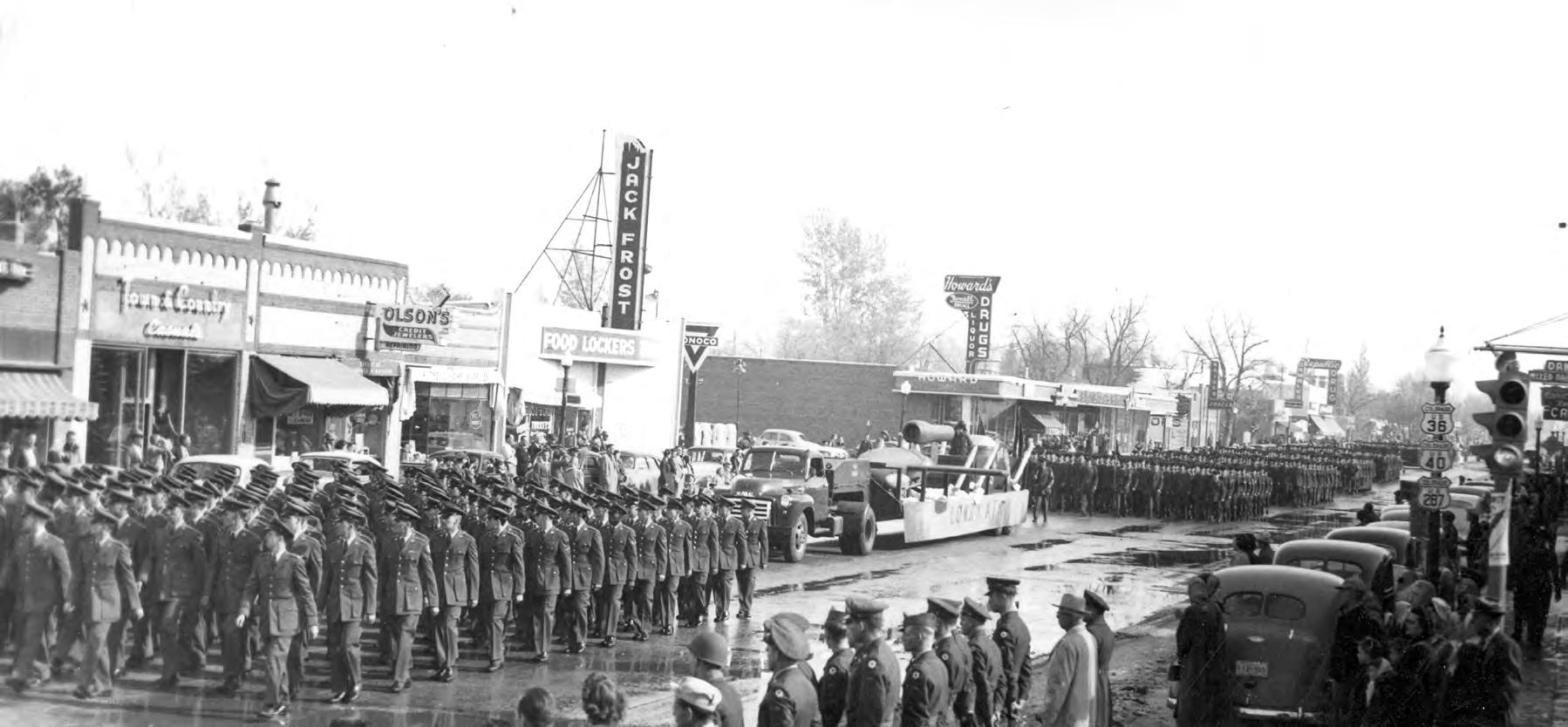 A column of servicemembers stationed at Lowry parade down Colfax in the late 1940s.