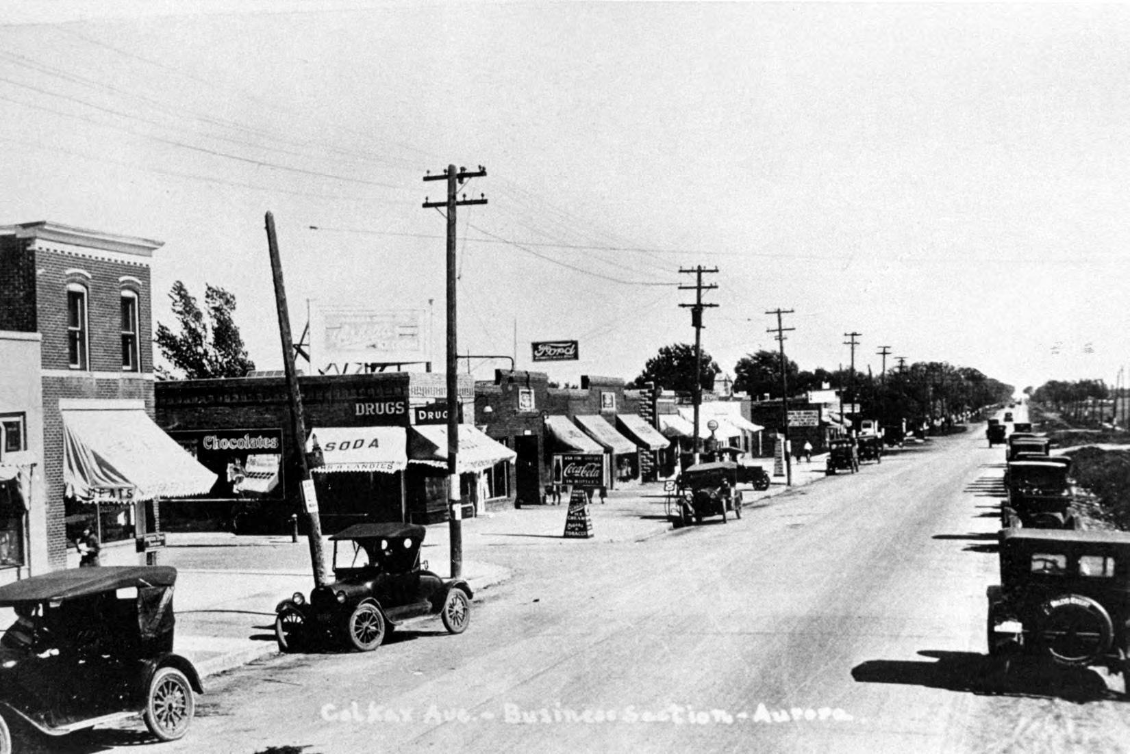 Businesses of small-town Aurora along East Colfax Avenue, 1921.