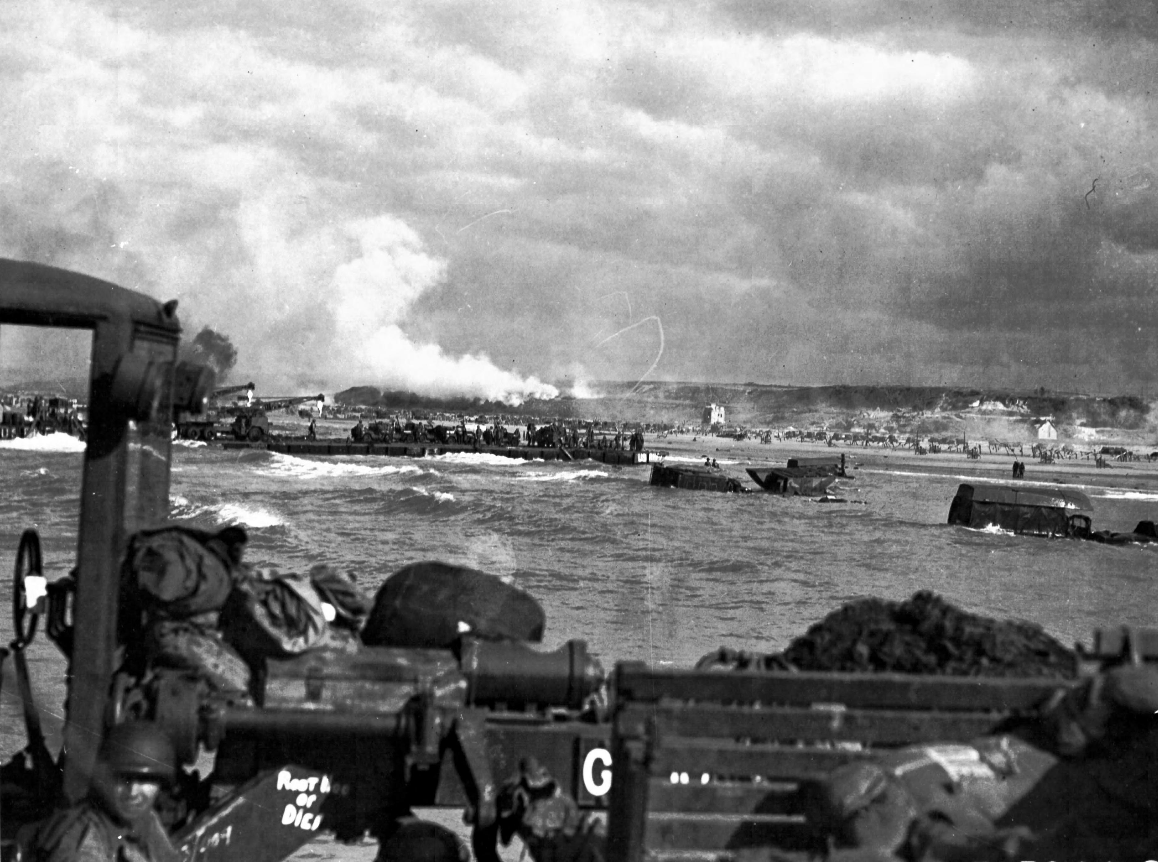 Landing ships putting cargo ashore on Omaha Beach at low tide during the early days of the Allied invasion, mid-June 1944. This photo demonstrates the vast number of supplies and equipment needed to sustain an offensive in Nazi-occupied Europe.