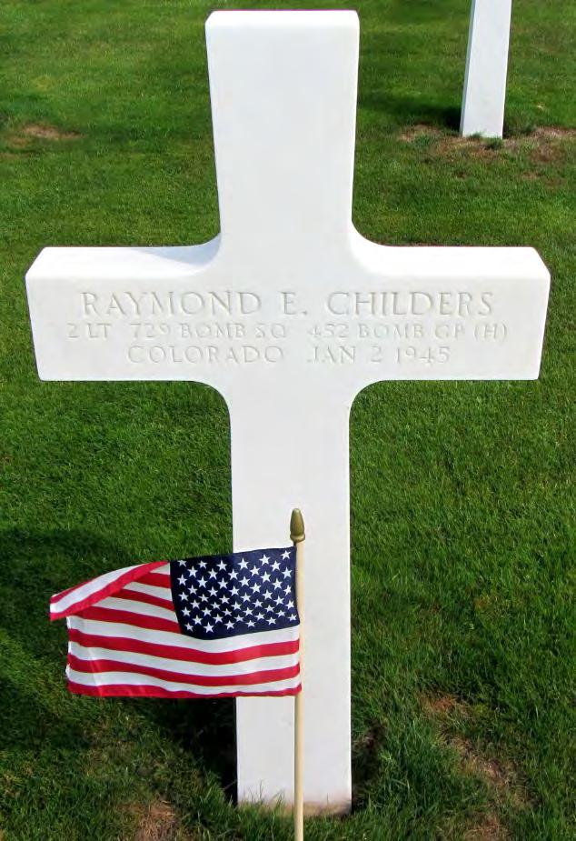Second Lieutenant Raymond E. Childers was killed in action on January 2, 1945, when his Boeing B-17 Flying Fortress was shot down by German antiaircraft fire over Bitburg, Germany. He served with the 729th Bomber Squadron, 452nd Bomb Group as part of the Army Air Forces. He was 23 years old at the time of his death.