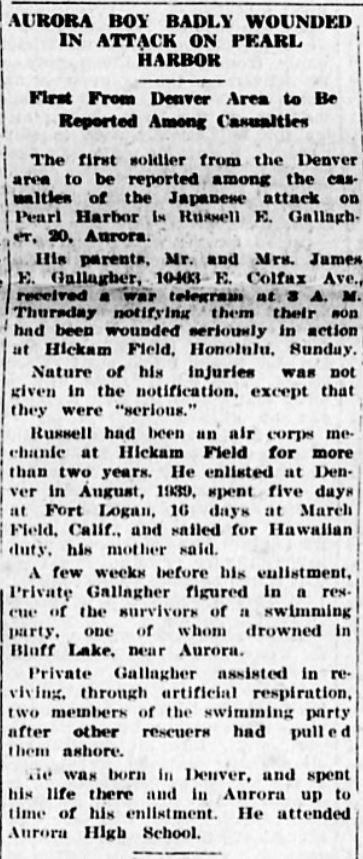 41 Coloradans died in the attack on Pearl Harbor. 32 of them were trapped inside the USS Arizona when it sank. This article identifies an Auroran, Private Russell Gallagher, among the wounded.