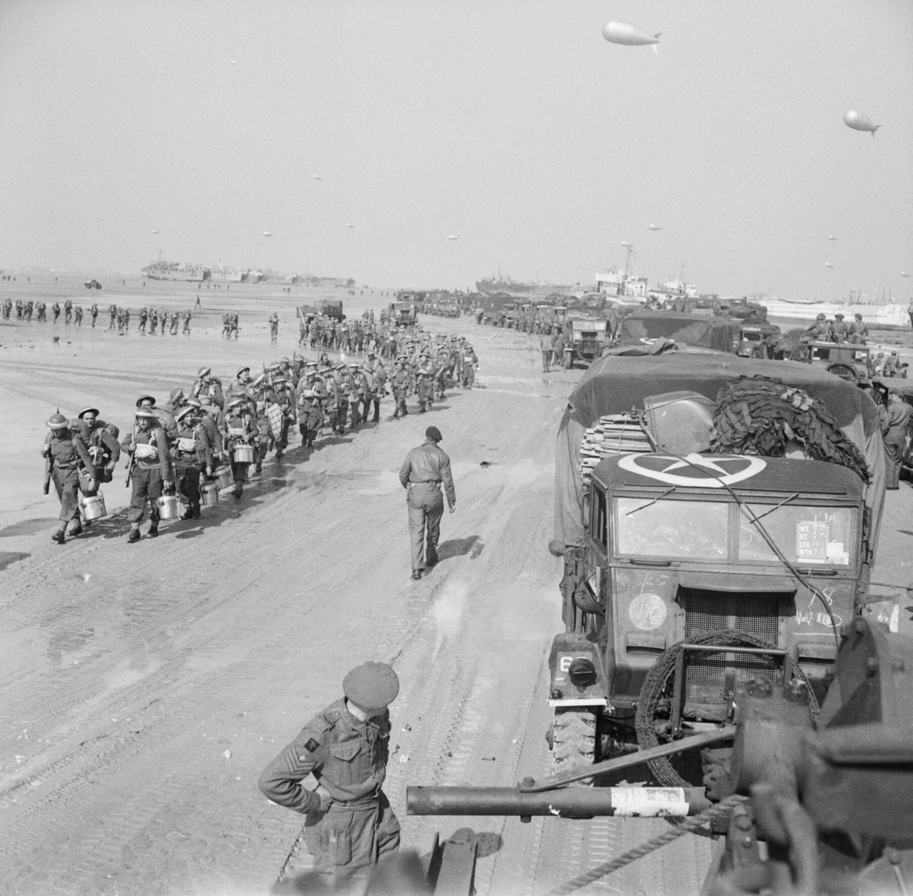 A column of troops, vehicles, and supplies offloading at Gold Beach the day following the invasion.