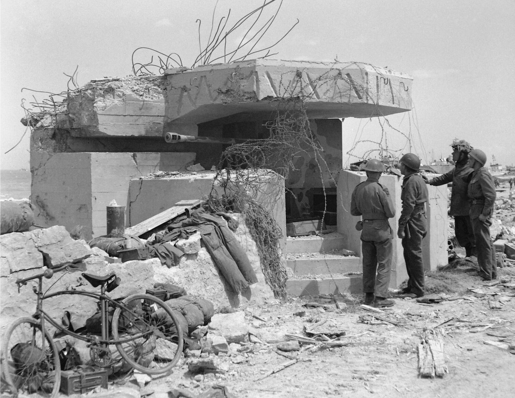 British soldiers examining a destroyed Nazi bunker following the D-Day invasion, 1944.