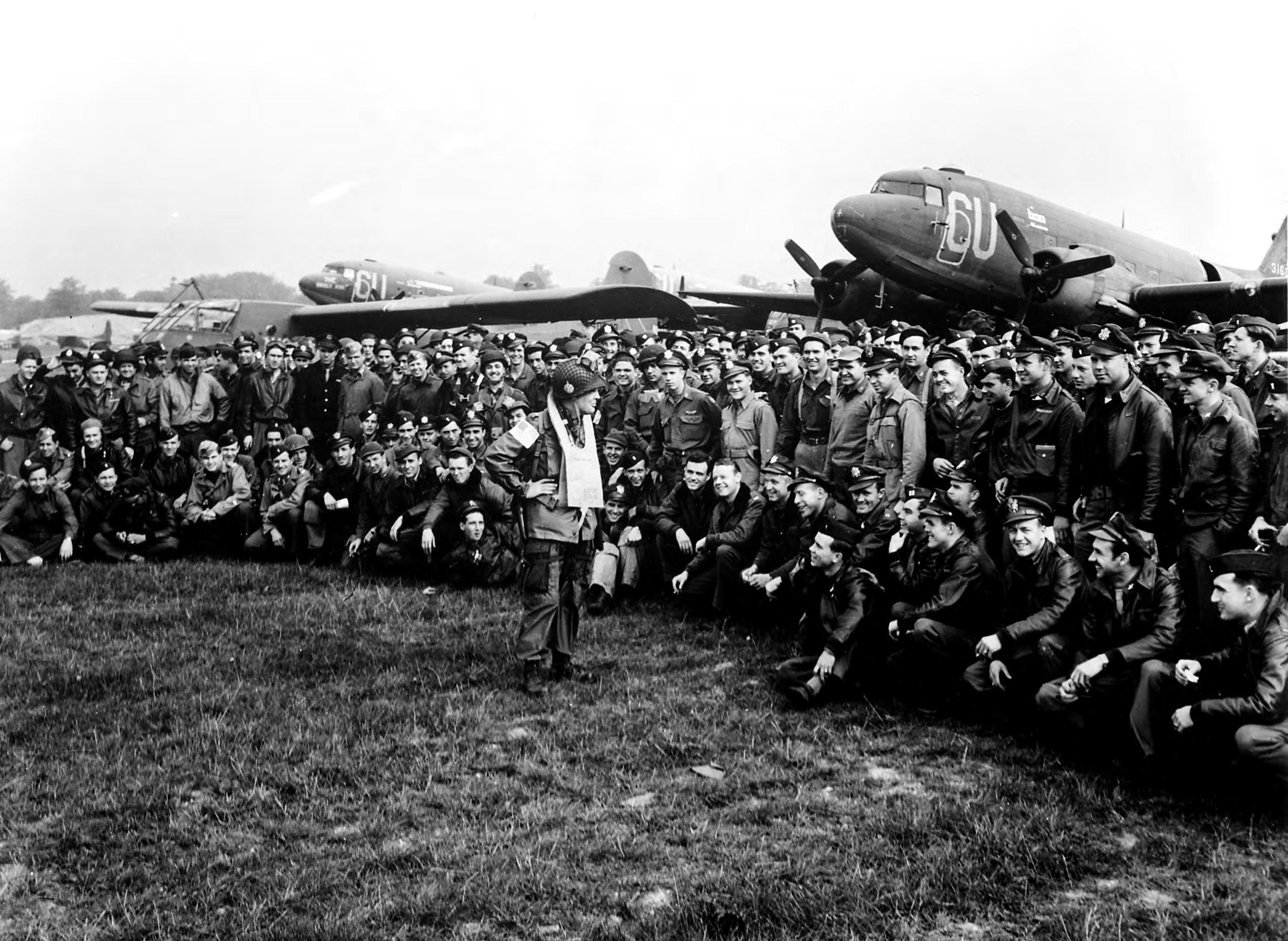 General Dwight D. Eisenhower gives the order of the day, "Full victory...nothing else" to paratroopers of the 101st Airborne Division, just before they board their airplanes to be dropped behind enemy lines on D-Day.