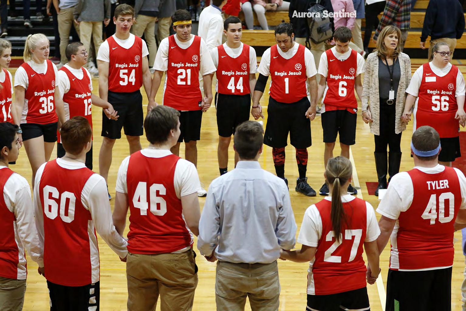 The Regis Jesuit High School unified basketball team huddles together before playing a game in December 2017.