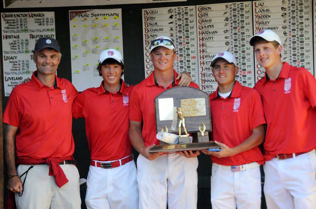 Members of the Regis Jesuit boys golf team holding the state championship trophy.