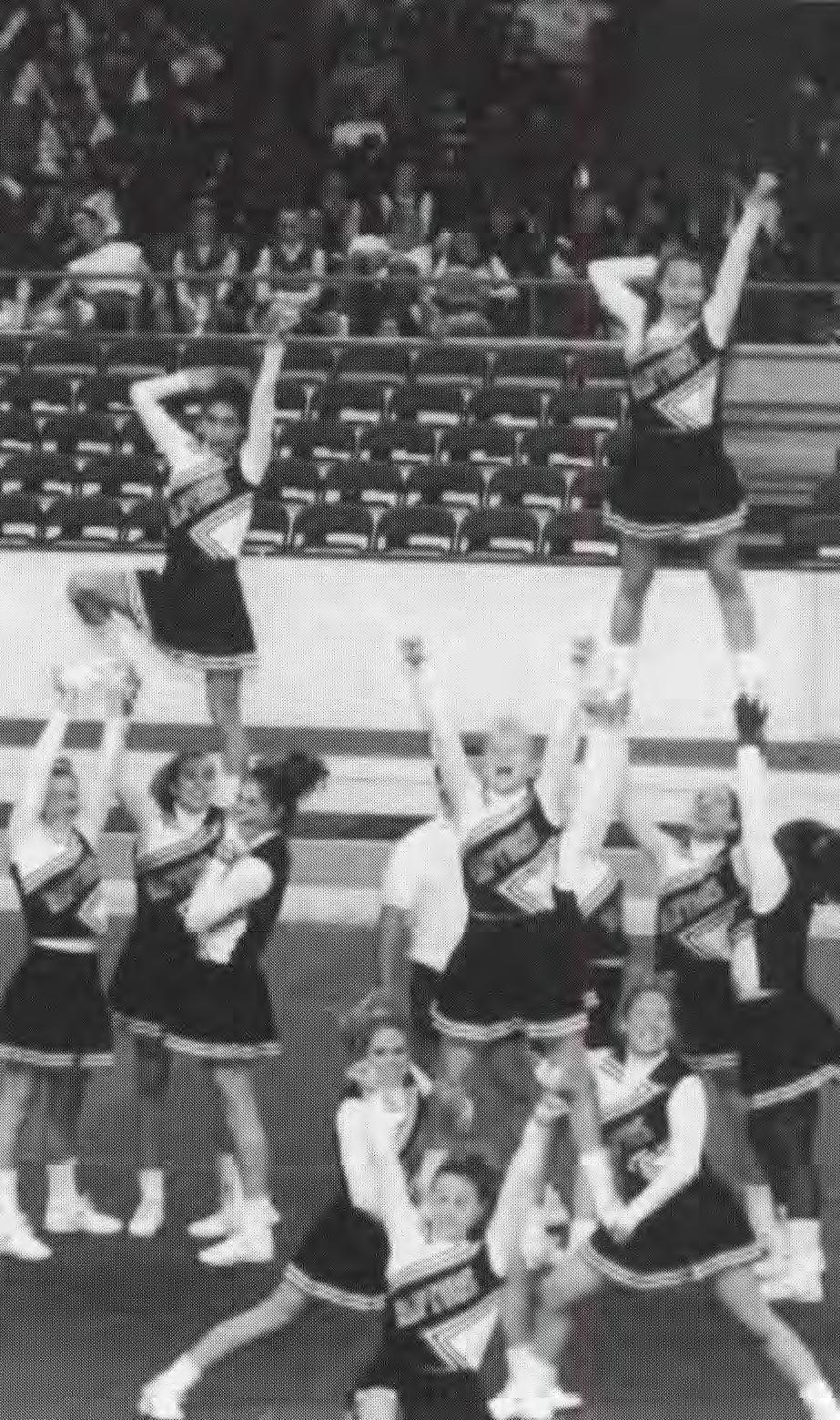 The Eaglecrest cheer team competing at the state finals on their way to their fourth state title in 1998.