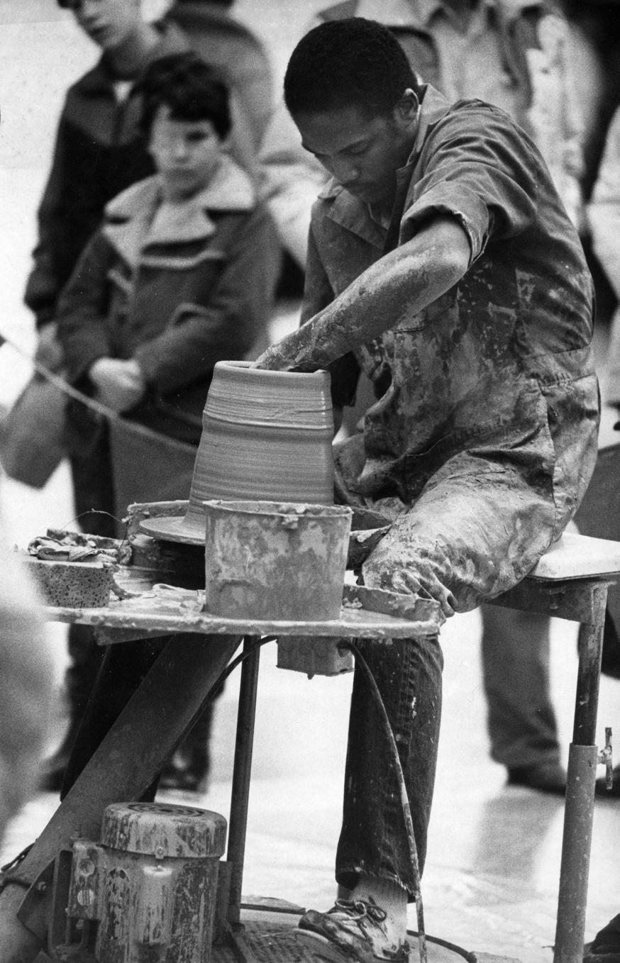This 1983 photo shows Hinkley High School student Timothy Hutchings throwing a pot.