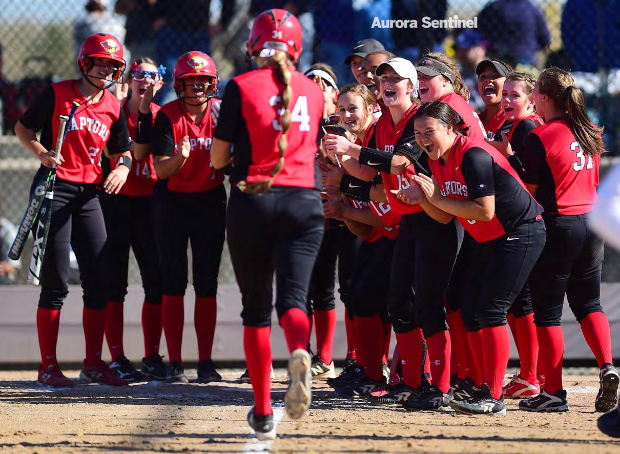 Aurora Central High School girls track and field team celebrating a winning effort.