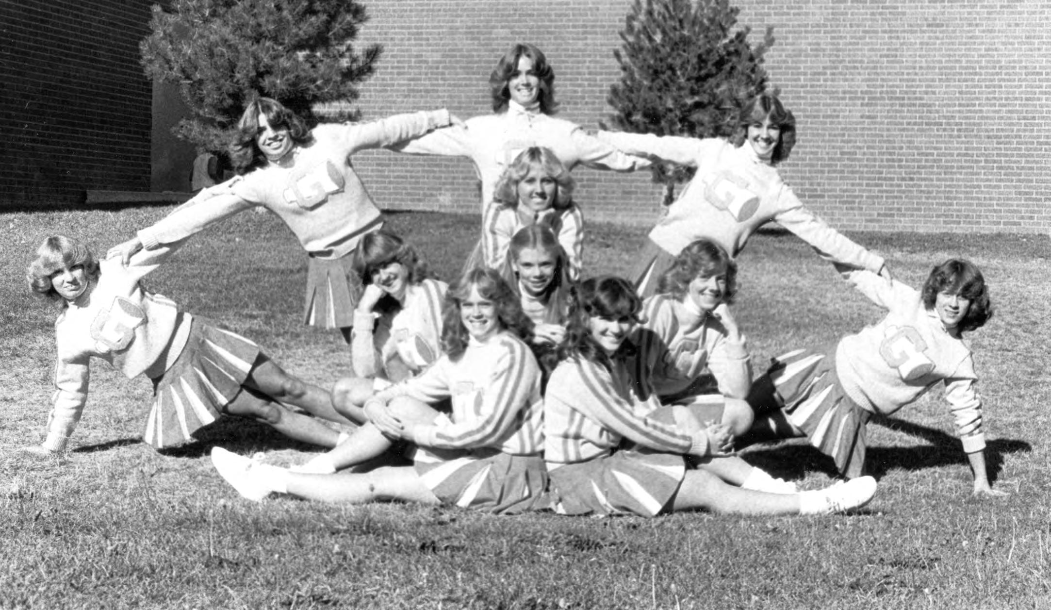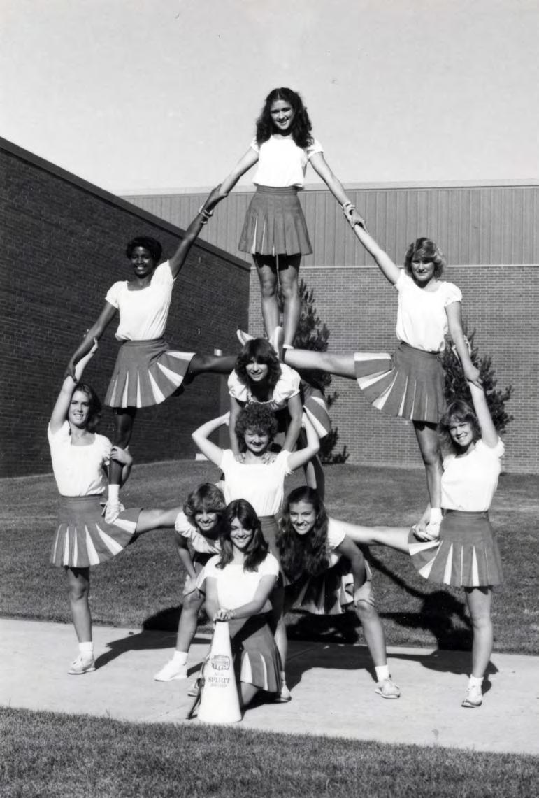 The Gateway High School’s varsity cheer team in a pyramid in the summer of 1982.