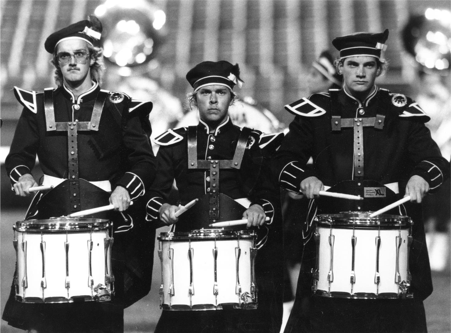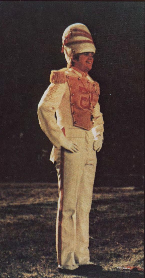 The band drum major brings the marching band to attention during a halftime performance in 1979.