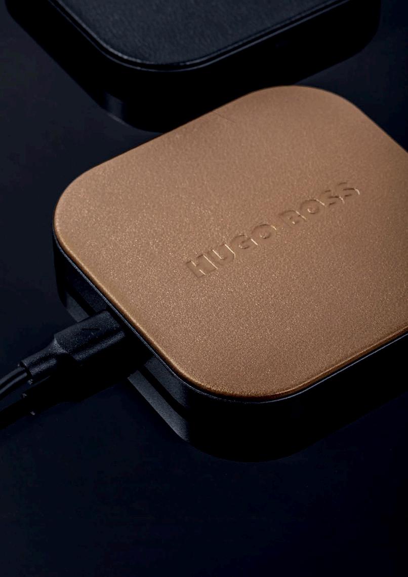 The wireless charger is delivered in a HUGO BOSS gift box.