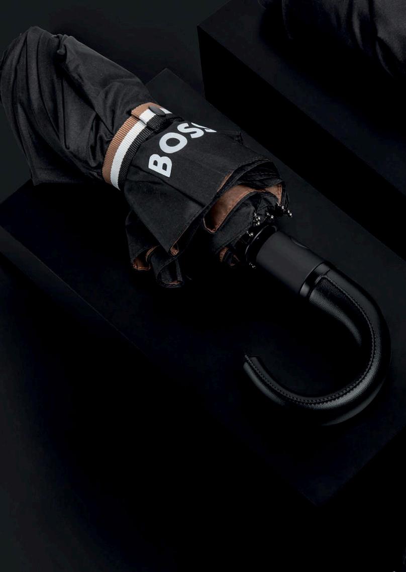 The Iconic City umbrella reflects modernity and elegance, with a nod to the BOSS brand identity in its tricolor closing strap. Other luxurious details include a double canopy, allowing for a bicolor effect: black outside and camel inside. The city umbrella weighs 600 grams and has a diameter of 113 cm when opened.